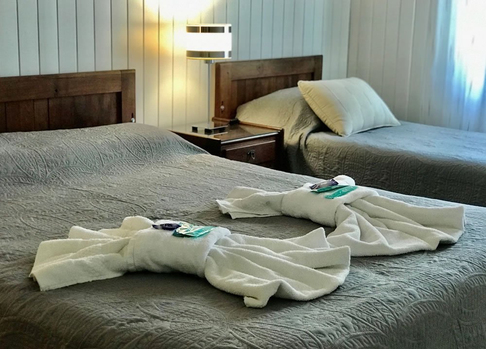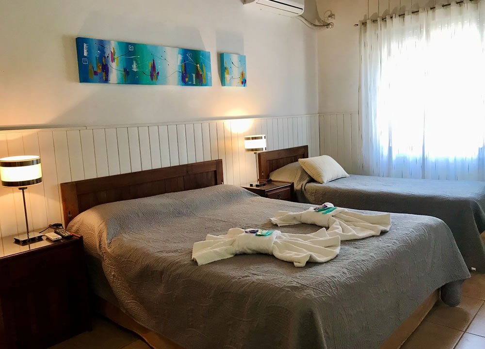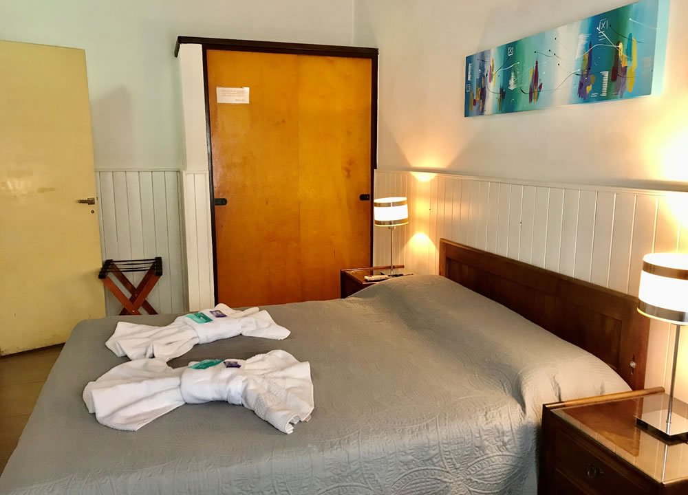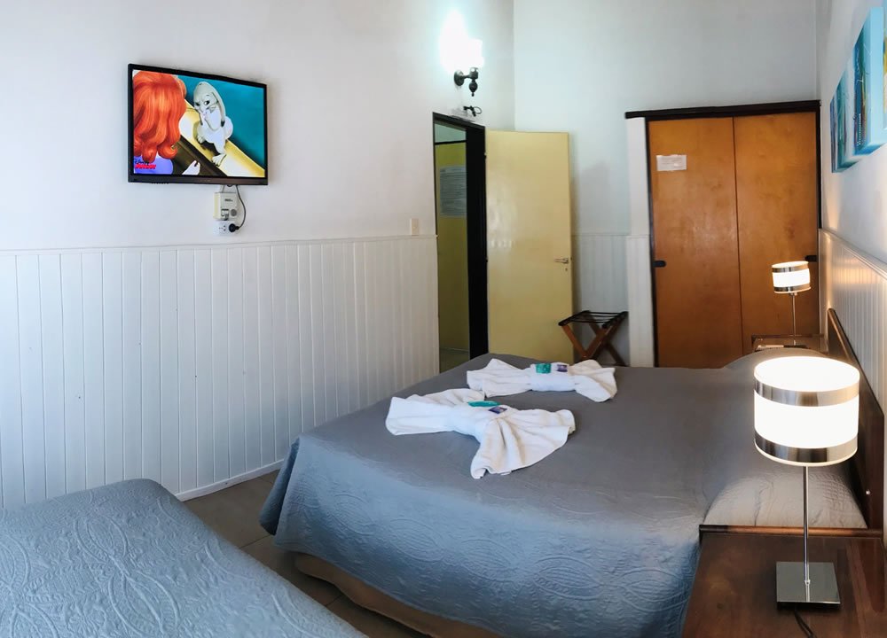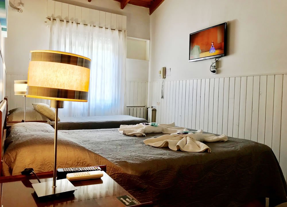 Habitación dúplex (2 habitaciones triples unidas por un hall de entrada con un baño privado) con capacidad para 4, 5 o 6 personas. 1 cama individual y una cama doble grande en cada dormitorio. Unidad en planta baja.